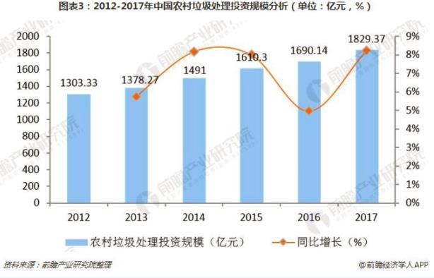 而且,在过去由于农村垃圾的种类与数量都较少,而且大多垃圾都容易分解,因此农户普遍采用堆肥、建议填埋或者自然腐烂等方式来解决。但是目前随着农村居民生活条件的改善,各项基础设施的完善,闲置、可堆肥的土地减少,而且垃圾数量也猛增,垃圾种类也越来越丰富,处理难度也越来越大。在这种情况下,对各主体不断加强对农村垃圾处理的投资力度,2012-2017年我国农村垃圾处理投资规模显著增加,至2017年农村垃圾处理的投资规模达到1829.37亿元,较上年同比增加8.24%。