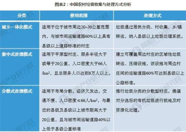 对于在城市周边农村的垃圾处理方式采用城乡一体化的运营模式,其垃圾通过居民分类、村收集、镇转运的一体化方式进行处理。而针对人口密度较大的农村,多通过建立可覆盖周边区域性垃圾转运、压缩的设施采用集中式处理的方式进行处理;面对经济欠发达、布局分散、人口密度较小的农村社会现状,多采用居民自觉分类,以村或县为主体的分散式处理方式。